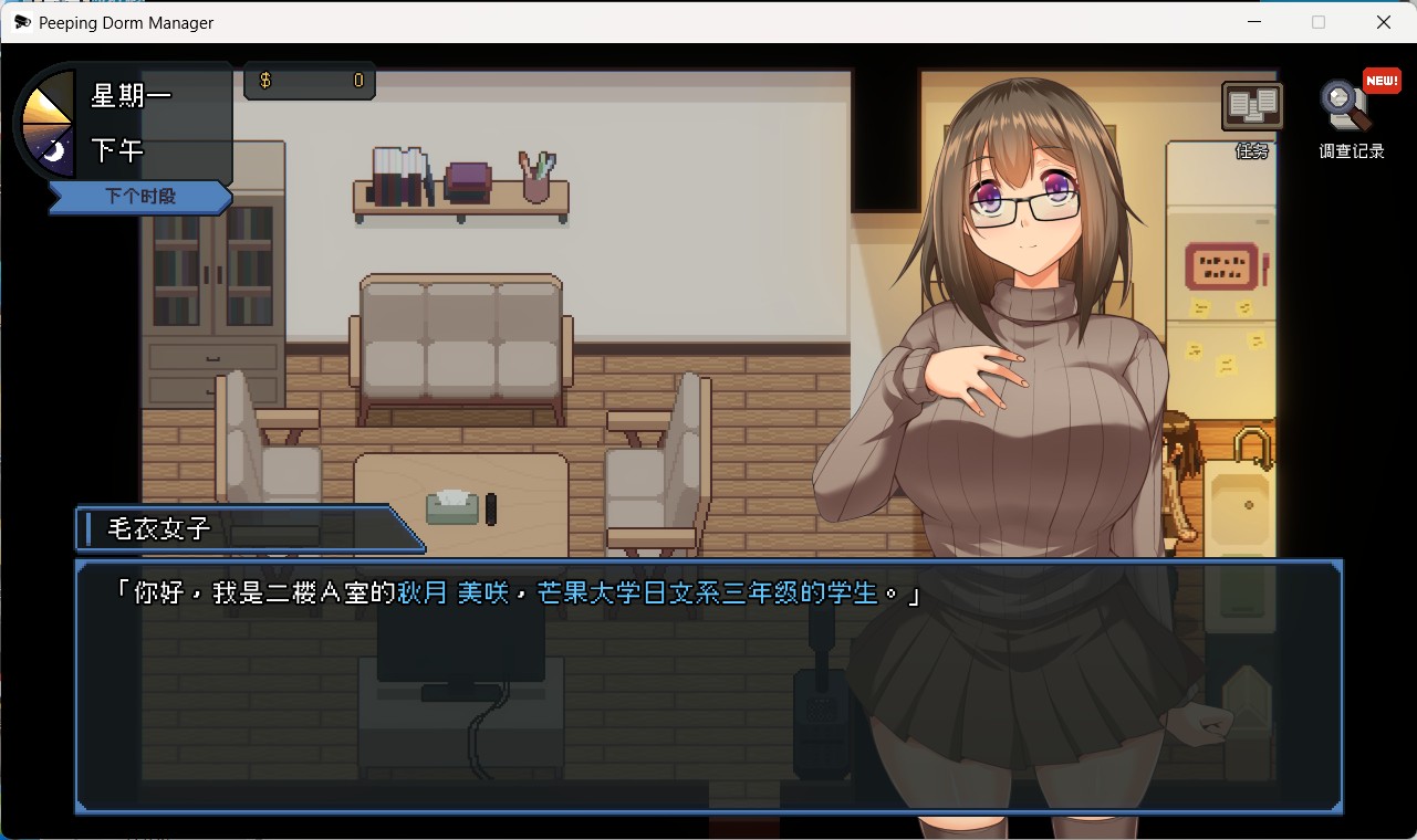 这是由[色色柴犬游戏工作室]与[芒果派对]联合开发的新作《管理员的窥视》(Peeping Dorm Manager)